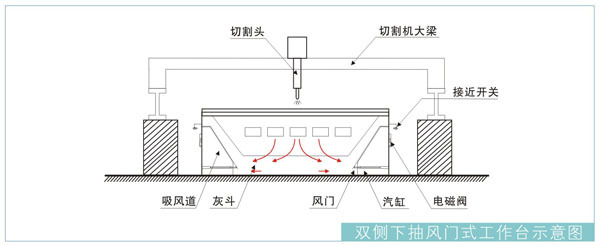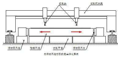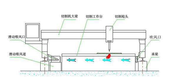 含尘气体经过切割平台-→切割平台内部的单侧吸风道-→排尘主管道-→除尘器-→洁净达标空气排出