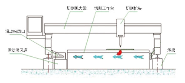 侧吸式烟尘净化系统采用吸风口固定在切割机龙门架上,吸风口与吸风道之间通过密封皮带密封,吸风口可随龙门架在吸风道上来回移动吸风,将切割的粉尘吸除。